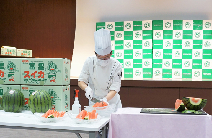 その後、会場で当院のレストランのシェフがスイカの入刀を行い、目に鮮やかな真っ赤な富里スイカをお披露目しました。いただいたスイカは、看護部をはじめとするスタッフでとても美味しくいただきました。