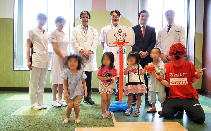 6月19日(月)、株式会社 千葉ジェッツふなばし様から当院に幼児用バスケットボールセットを寄贈いただきました。これは、指定難病とされる潰瘍性大腸炎と戦っている原修太選手が、病気で苦しむ子どもたちに元気を届けたいという想いから始められた社会貢献活動(ハラの輪)の一環として、当院にお申し出をいただいたものです。