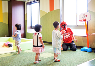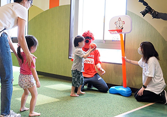 寄贈式の後、小児病棟で子どもたちによるバスケットボール体験を行いました。地域振興キャラクターのマスク・ ド・オッチーと一緒に、次々とゴールを決める子どもたちのイキイキした表情が印象的でした。ミニゴールセットは小児病棟で大切に使用させていただきます。