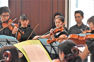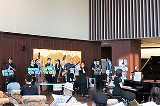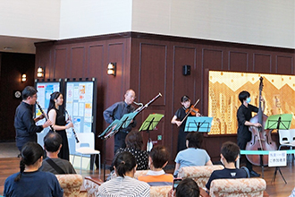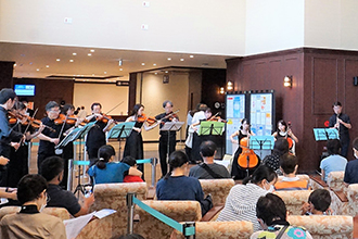 総合ロビーに配置されたグランドピアノをはじめ、バイオリン、チェロ、ビオラ、コントラバス、クラリネット、オーボエ、ファゴット、トランペットなどが奏でるさまざまな演奏に、参加者からは大拍手が送られました。