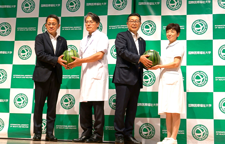 5月21日、富里市と富里市農業協同組合(JA富里市)様から、富里市の特産品であるスイカ(春のだんらん)を寄贈いただきました。2020年の開院以来4回目となります。当院を代表して、吉野病院長と伊藤看護部長が、ずっしりと重い立派な富里スイカをいただきました。