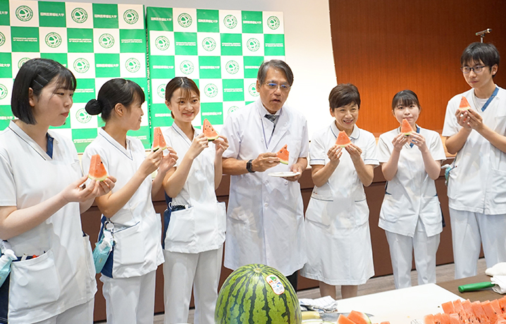 その後、当院のレストランのシェフがスイカに入刀、会場中に甘い香りが広がる中で、真っ赤な富里スイカをお披露目しました。この春に入職した看護師たちでさっそく試食させていただき、みな口々に甘くて美味しいと言いながらありがたく頂戴しました。