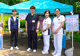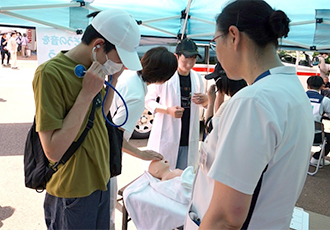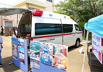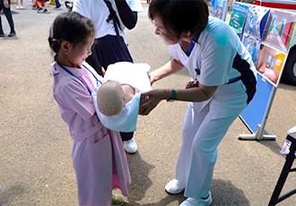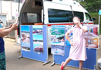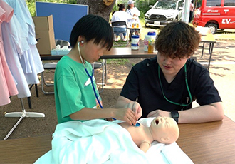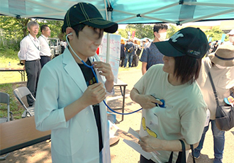 6月8日、成田市の社会福祉法人 大成会で「あじさい祭り」が開催され、昨年に続き「職業体験」コーナーに参加させていただきました。この職業体験には、三里塚消防署、成田警察署、成田市内郵便局、ANA成田エアポートサービス㈱など市内のさまざまな団体が参加されており、当院は「お医者さんとナースの制服を着てみよう」「心臓の音を聴いてみよう」「赤ちゃんを抱っこしてみよう」「救急車をまじかで見てみよう」などの体験をご提供しました。白衣やナース服を試着したこどもたちは、聴診器で心臓の音を聴いたり、赤ちゃんの精密な模型を興味津々で抱っこしてみたり、初めて乗る救急車の中に歓声をあげたりしていました。